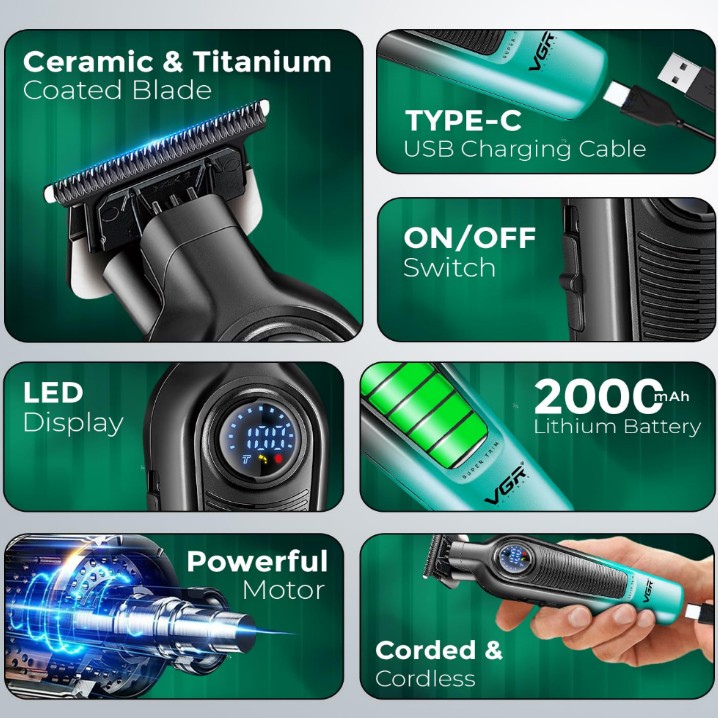 • Lame en céramique avec tête d’huile : La lame en céramique de haute qualité offre longévité et netteté, tandis que la tête d’huile permet à la tondeuse de fonctionner de manière fluide et efficace, garantissant des performances de premier ordre de manière constante.